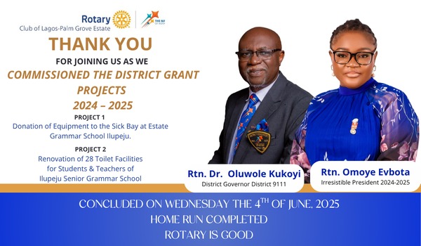 She expressed heartfelt appreciation to The Board and Members of Rotary Club of Lagos Palm Grove Estate, “None of these would be possible without the selfless commitment of our Club Board and every member who brought passion, resources, and time to serve.” Rotary District 9111 and its District Governor, Rtn. Dr. Oluwole Kukoyi, for his inspirational leadership,.