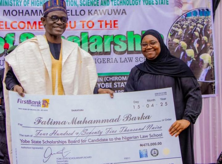 Yobe State Governor Mai Mala Buni on Wednesday presented tuition fees and laptops to...